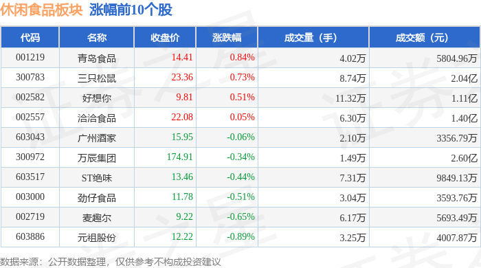 证券之星消息,10月30日休闲食品板块较上一交易日下跌0.94%,西麦食品领跌。当日上证指数报收于3986.9,下跌0.73%。深证成指报收于13532.13,下跌1.16%。休闲食品板块个股涨跌见下表: