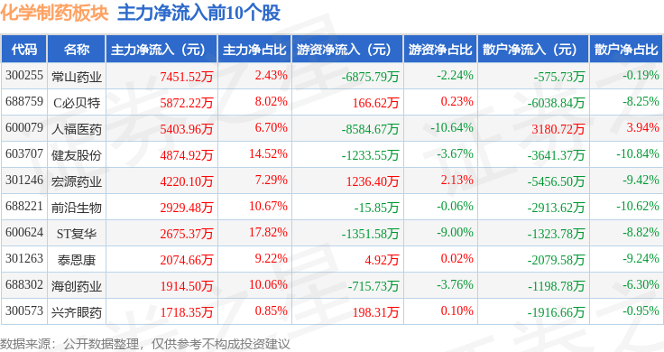 从资金流向上来看,当日化学制药板块主力资金净流出22.68亿元,游资资金净流入7.6亿元,散户资金净流入15.08亿元。化学制药板块个股资金流向见下表: