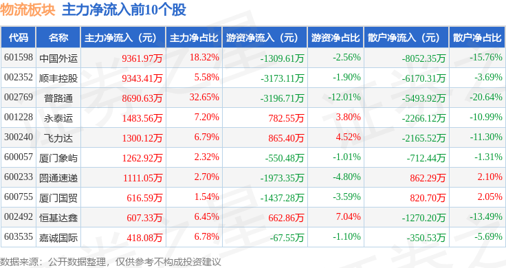 从资金流向上来看,当日物流板块主力资金净流出1859.86万元,游资资金净流入3620.6万元,散户资金净流出1760.74万元。物流板块个股资金流向见下表: