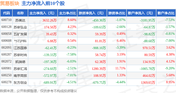 从资金流向上来看,当日贸易板块主力资金净流出8591.47万元,游资资金净流入1643.6万元,散户资金净流入6947.87万元。贸易板块个股资金流向见下表: