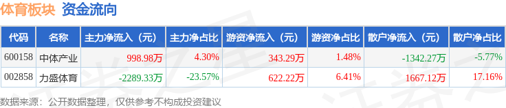 从资金流向上来看,当日体育板块主力资金净流出1290.36万元,游资资金净流入965.51万元,散户资金净流入324.85万元。体育板块个股资金流向见下表: