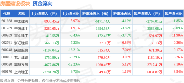 从资金流向上来看,当日房屋建设板块主力资金净流出2257.76万元,游资资金净流出3415.01万元,散户资金净流入5672.77万元。房屋建设板块个股资金流向见下表: