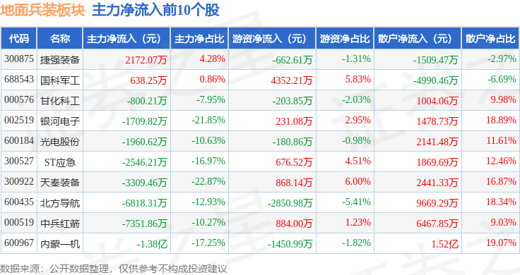 从资金流向上来看,当日地面兵装板块主力资金净流出9.67亿元,游资资金净流入1.4亿元,散户资金净流入8.27亿元。地面兵装板块个股资金流向见下表: