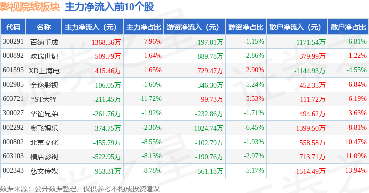 从资金流向上来看,当日影视院线板块主力资金净流出4.16亿元,游资资金净流入1282.84万元,散户资金净流入4.03亿元。影视院线板块个股资金流向见下表: