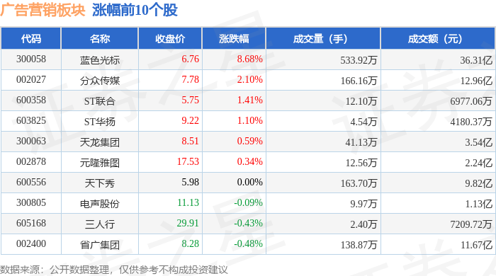 证券之星消息,10月30日广告营销板块较上一交易日上涨0.84%,蓝色光标领涨。当日上证指数报收于3986.9,下跌0.73%。深证成指报收于13532.13,下跌1.16%。广告营销板块个股涨跌见下表:
