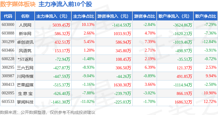 从资金流向上来看,当日数字媒体板块主力资金净流出8076.33万元,游资资金净流入4765.32万元,散户资金净流入3311.01万元。数字媒体板块个股资金流向见下表: