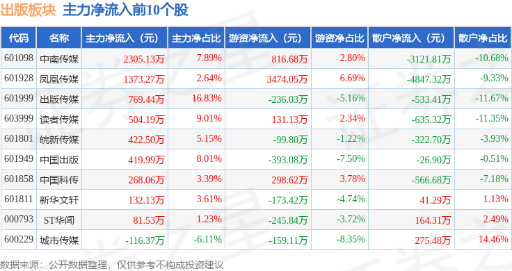 从资金流向上来看,当日出版板块主力资金净流出3.08亿元,游资资金净流入1.57亿元,散户资金净流入1.51亿元。出版板块个股资金流向见下表: