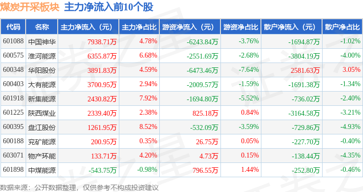 从资金流向上来看,当日煤炭开采板块主力资金净流出3.86亿元,游资资金净流出6115.88万元,散户资金净流入4.47亿元。煤炭开采板块个股资金流向见下表: