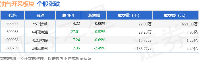 证券之星消息,10月30日油气开采板块较上一交易日下跌0.57%,洲际油气领跌。当日上证指数报收于3986.9,下跌0.73%。深证成指报收于13532.13,下跌1.16%。油气开采板块个股涨跌见下表: