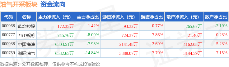 从资金流向上来看,当日油气开采板块主力资金净流出1.34亿元,游资资金净流入6347.24万元,散户资金净流入7062.34万元。油气开采板块个股资金流向见下表: