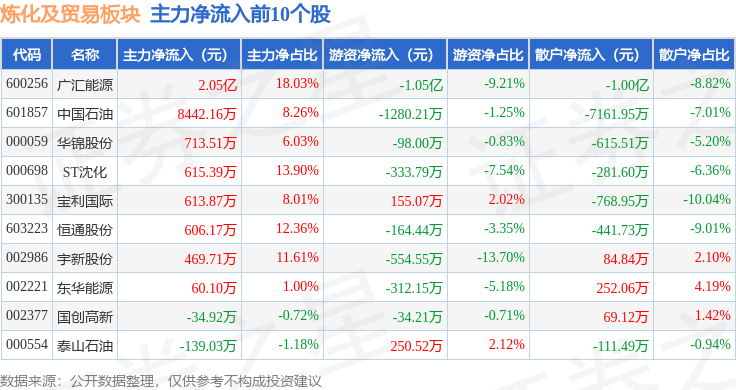 从资金流向上来看,当日炼化及贸易板块主力资金净流入5853.89万元,游资资金净流出9666.69万元,散户资金净流入3812.8万元。炼化及贸易板块个股资金流向见下表: