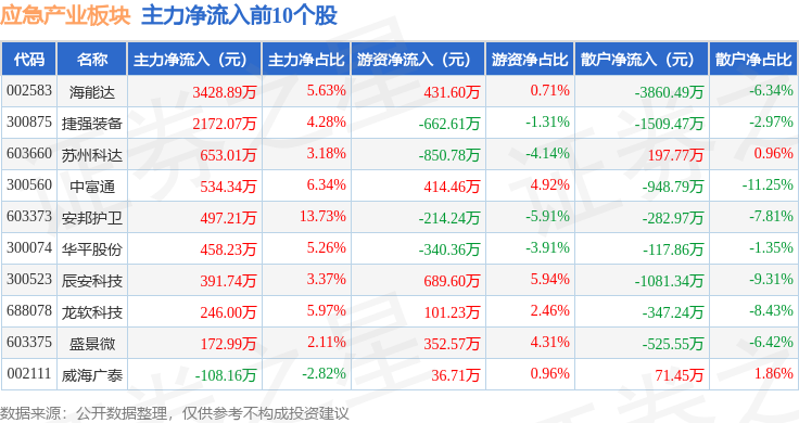 从资金流向上来看,当日应急产业板块主力资金净流出7.07亿元,游资资金净流入8289.82万元,散户资金净流入6.24亿元。应急产业板块个股资金流向见下表: