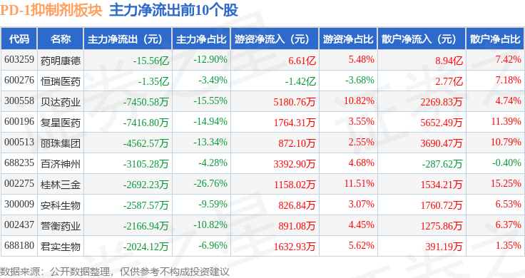 从资金流向上来看,当日PD-1抑制剂板块主力资金净流出20.47亿元,游资资金净流入7.33亿元,散户资金净流入13.14亿元。PD-1抑制剂板块个股资金流向见下表: