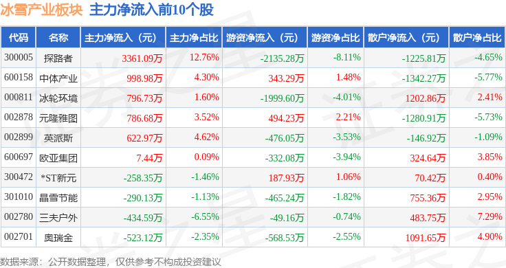 从资金流向上来看,当日冰雪产业板块主力资金净流出2.45亿元,游资资金净流出8531.33万元,散户资金净流入3.3亿元。冰雪产业板块个股资金流向见下表:
