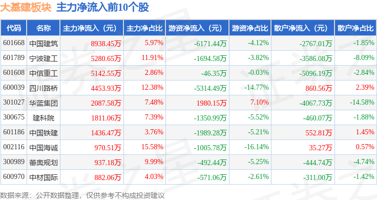 从资金流向上来看,当日大基建板块主力资金净流出11.34亿元,游资资金净流入2614.56万元,散户资金净流入11.08亿元。大基建板块个股资金流向见下表: