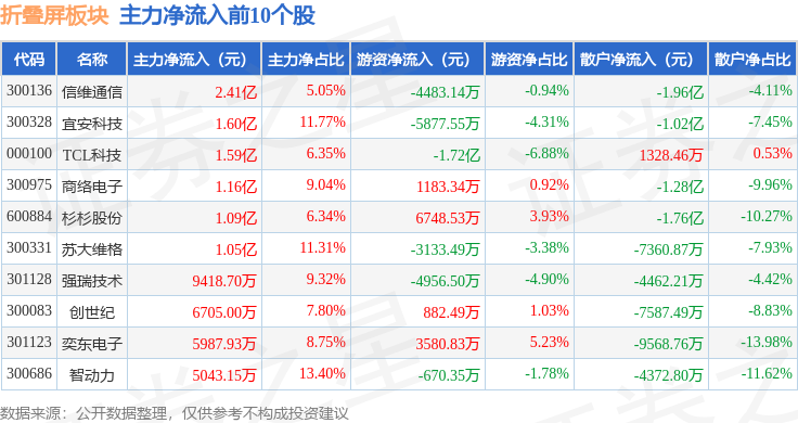 从资金流向上来看,当日折叠屏板块主力资金净流出36.18亿元,游资资金净流入11.22亿元,散户资金净流入24.96亿元。折叠屏板块个股资金流向见下表: