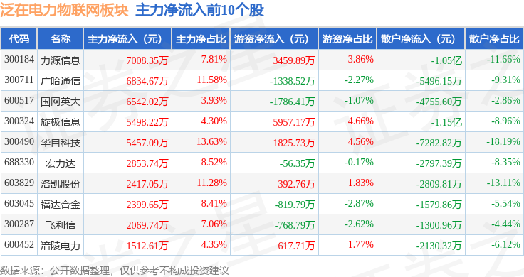 从资金流向上来看,当日泛在电力物联网板块主力资金净流出66.15亿元,游资资金净流入14.91亿元,散户资金净流入51.24亿元。泛在电力物联网板块个股资金流向见下表: