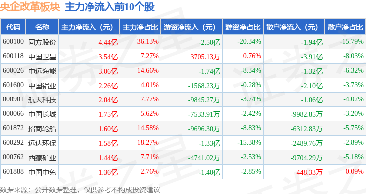 从资金流向上来看,当日央企改革板块主力资金净流出86.41亿元,游资资金净流入19.08亿元,散户资金净流入67.33亿元。央企改革板块个股资金流向见下表: