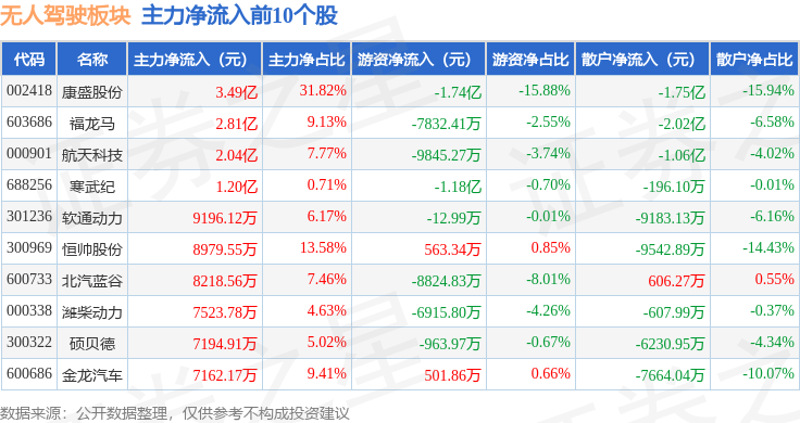 从资金流向上来看,当日无人驾驶板块主力资金净流出103.94亿元,游资资金净流入28.73亿元,散户资金净流入75.21亿元。无人驾驶板块个股资金流向见下表: