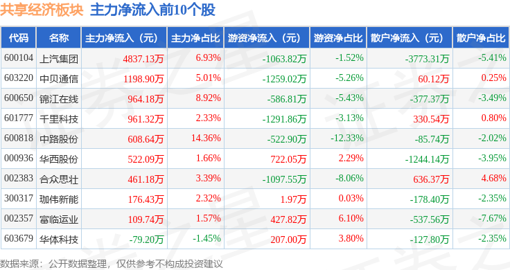 从资金流向上来看,当日共享经济板块主力资金净流出12.84亿元,游资资金净流入6417.61万元,散户资金净流入12.2亿元。共享经济板块个股资金流向见下表:
