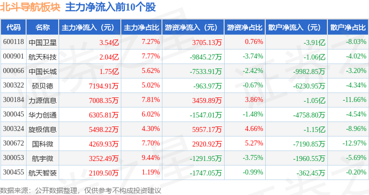 从资金流向上来看,当日北斗导航板块主力资金净流出6.04亿元,游资资金净流入2.36亿元,散户资金净流入3.68亿元。北斗导航板块个股资金流向见下表: