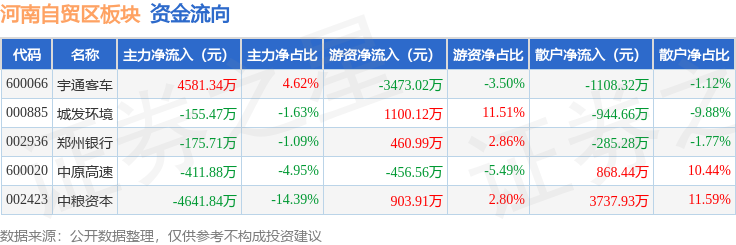 从资金流向上来看,当日河南自贸区板块主力资金净流出803.56万元,游资资金净流出1464.56万元,散户资金净流入2268.12万元。河南自贸区板块个股资金流向见下表:
