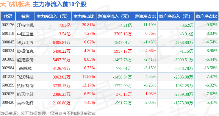 从资金流向上来看,当日大飞机板块主力资金净流出40.08亿元,游资资金净流入9.49亿元,散户资金净流入30.58亿元。大飞机板块个股资金流向见下表: