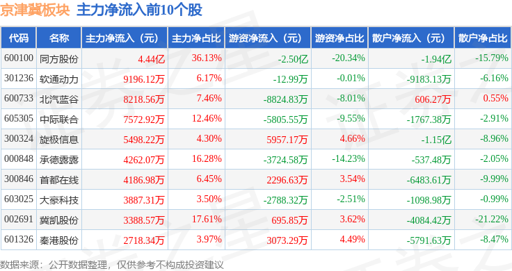 从资金流向上来看,当日京津冀板块主力资金净流出32.27亿元,游资资金净流入4.54亿元,散户资金净流入27.72亿元。京津冀板块个股资金流向见下表: