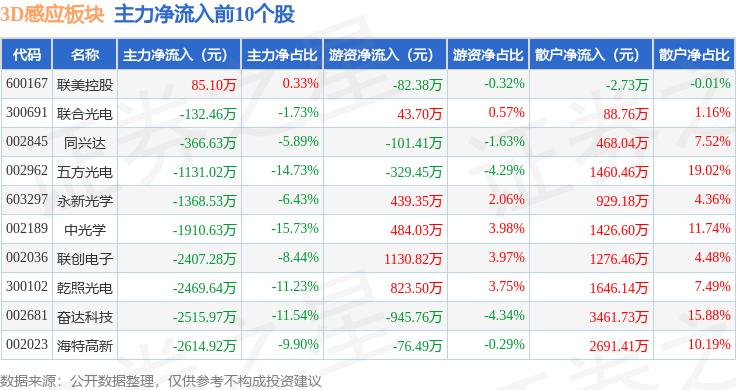 从资金流向上来看,当日3D感应板块主力资金净流出22.46亿元,游资资金净流入5.96亿元,散户资金净流入16.51亿元。3D感应板块个股资金流向见下表: