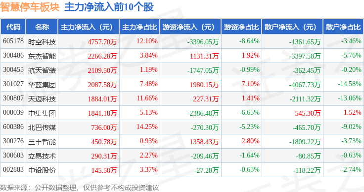 从资金流向上来看,当日智慧停车板块主力资金净流出5.91亿元,游资资金净流入1.44亿元,散户资金净流入4.47亿元。智慧停车板块个股资金流向见下表: