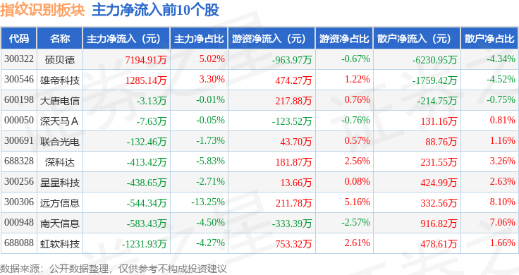 从资金流向上来看,当日指纹识别板块主力资金净流出22.84亿元,游资资金净流入10.35亿元,散户资金净流入12.49亿元。指纹识别板块个股资金流向见下表: