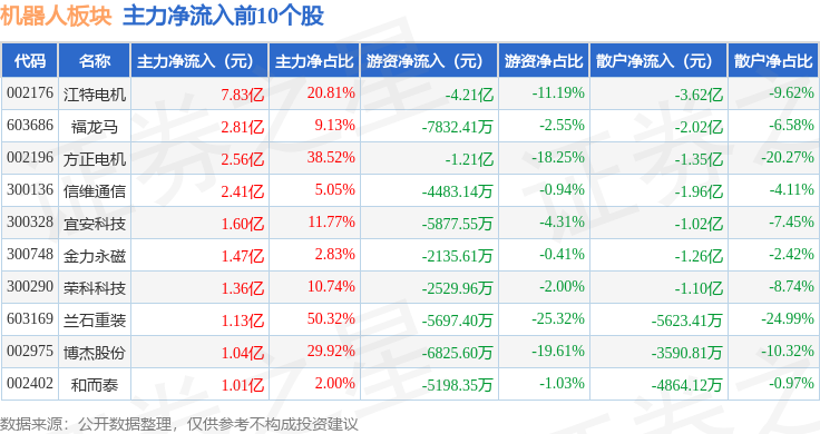 从资金流向上来看,当日机器人板块主力资金净流出180.0亿元,游资资金净流入49.28亿元,散户资金净流入130.72亿元。机器人板块个股资金流向见下表: