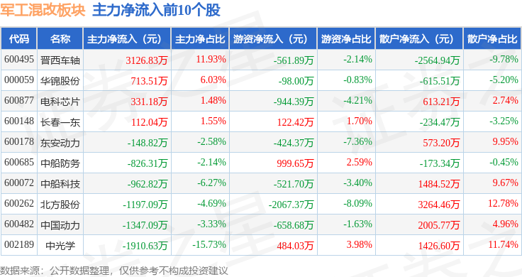 从资金流向上来看,当日军工混改板块主力资金净流出13.31亿元,游资资金净流入1.84亿元,散户资金净流入11.47亿元。军工混改板块个股资金流向见下表: