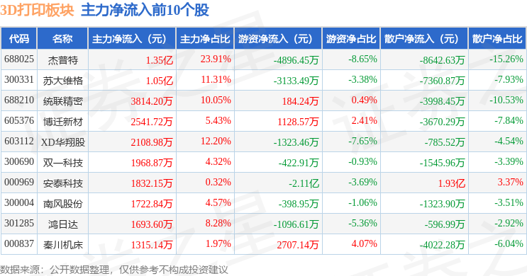 从资金流向上来看,当日3D打印板块主力资金净流出20.8亿元,游资资金净流入6.22亿元,散户资金净流入14.57亿元。3D打印板块个股资金流向见下表: