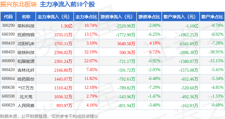 从资金流向上来看,当日振兴东北板块主力资金净流出7.31亿元,游资资金净流入1.5亿元,散户资金净流入5.81亿元。振兴东北板块个股资金流向见下表: