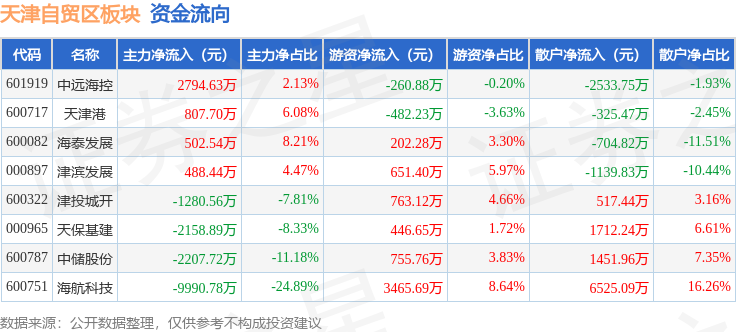 从资金流向上来看,当日天津自贸区板块主力资金净流出1.1亿元,游资资金净流入5541.79万元,散户资金净流入5502.86万元。天津自贸区板块个股资金流向见下表: