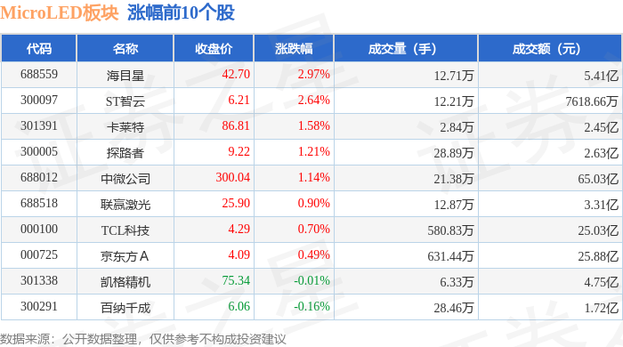证券之星消息,10月30日MicroLED板块较上一交易日下跌0.87%,隆利科技领跌。当日上证指数报收于3986.9,下跌0.73%。深证成指报收于13532.13,下跌1.16%。MicroLED板块个股涨跌见下表: