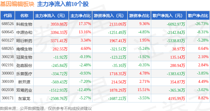 从资金流向上来看,当日基因编辑板块主力资金净流出6703.67万元,游资资金净流入1.25亿元,散户资金净流出5795.09万元。基因编辑板块个股资金流向见下表: