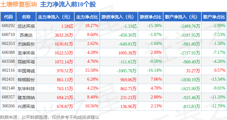 从资金流向上来看,当日土壤修复板块主力资金净流出5.13亿元,游资资金净流入9603.55万元,散户资金净流入4.17亿元。土壤修复板块个股资金流向见下表: