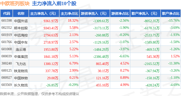 从资金流向上来看,当日中欧班列板块主力资金净流入1.39亿元,游资资金净流出5926.15万元,散户资金净流出7960.57万元。中欧班列板块个股资金流向见下表: