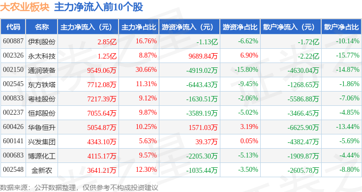 从资金流向上来看,当日大农业板块主力资金净流出10.84亿元,游资资金净流入3.32亿元,散户资金净流入7.52亿元。大农业板块个股资金流向见下表: