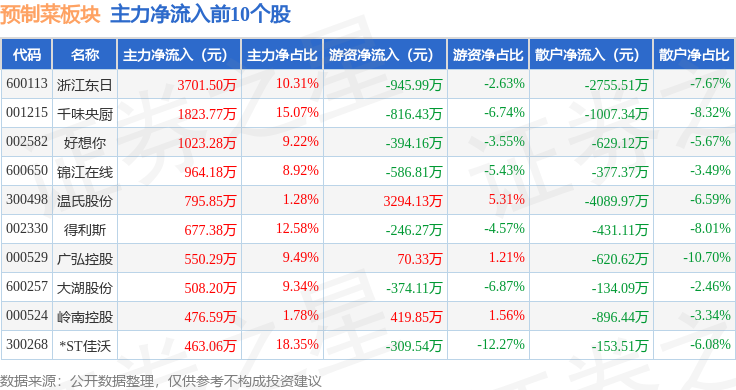 从资金流向上来看,当日预制菜板块主力资金净流出5.66亿元,游资资金净流入1410.09万元,散户资金净流入5.52亿元。预制菜板块个股资金流向见下表: