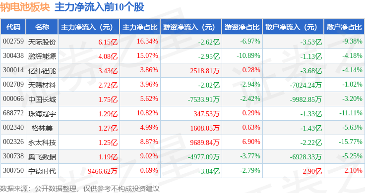 从资金流向上来看,当日钠电池板块主力资金净流入9.38亿元,游资资金净流出5.96亿元,散户资金净流出3.41亿元。钠电池板块个股资金流向见下表: