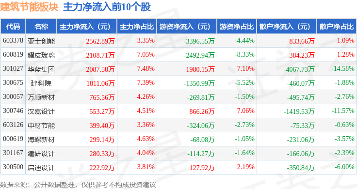 从资金流向上来看,当日建筑节能板块主力资金净流出8992.22万元,游资资金净流出1341.71万元,散户资金净流入1.03亿元。建筑节能板块个股资金流向见下表: