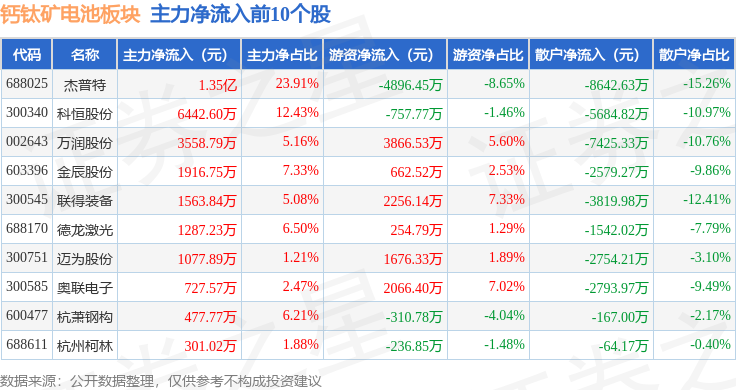 从资金流向上来看,当日钙钛矿电池板块主力资金净流出17.53亿元,游资资金净流入2.19亿元,散户资金净流入15.35亿元。钙钛矿电池板块个股资金流向见下表: