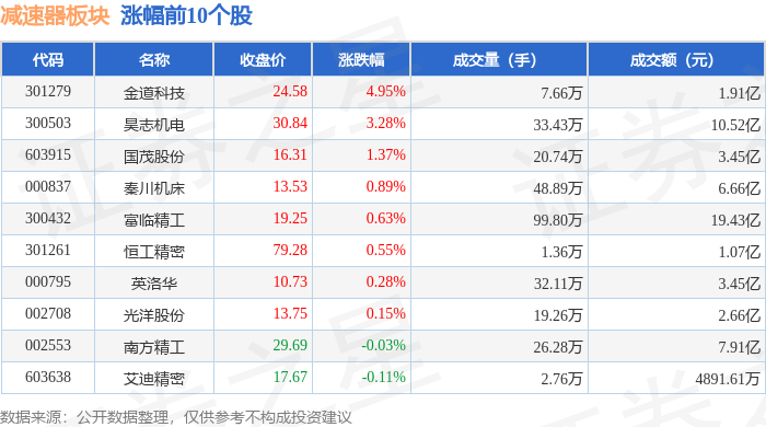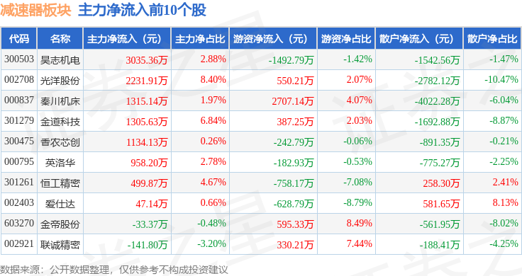 从资金流向上来看,当日减速器板块主力资金净流出14.04亿元,游资资金净流入4.74亿元,散户资金净流入9.31亿元。减速器板块个股资金流向见下表:
