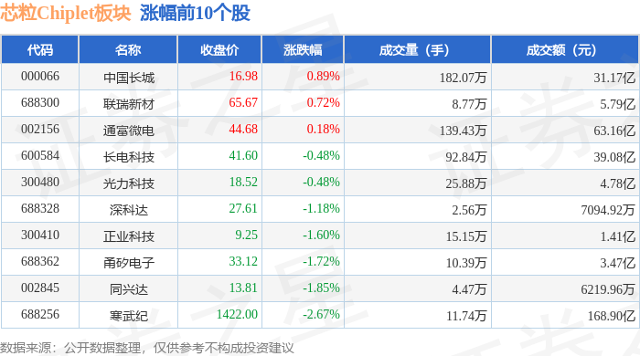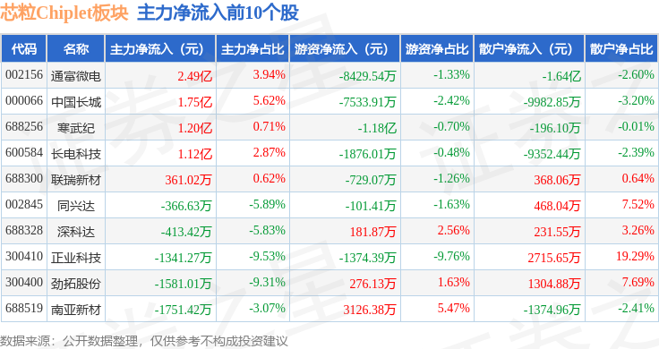 从资金流向上来看,当日芯粒Chiplet板块主力资金净流出3556.99万元,游资资金净流出2.86亿元,散户资金净流入3.21亿元。芯粒Chiplet板块个股资金流向见下表: