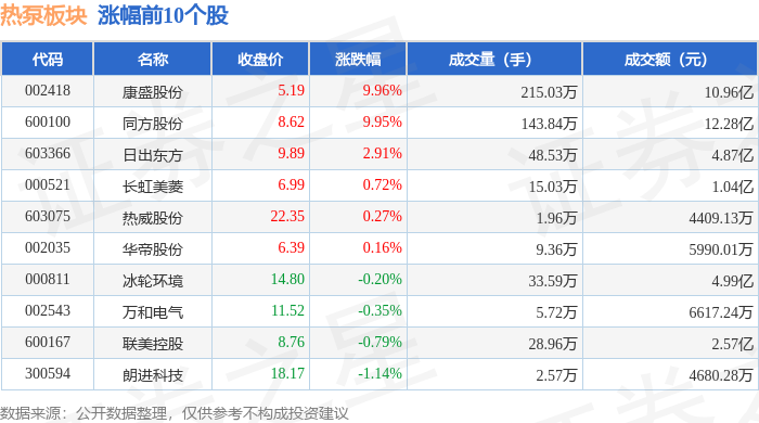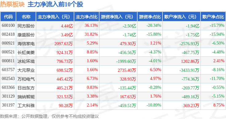 从资金流向上来看,当日热泵板块主力资金净流入4.05亿元,游资资金净流出3.35亿元,散户资金净流出6998.34万元。热泵板块个股资金流向见下表: