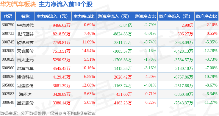 从资金流向上来看,当日华为汽车板块主力资金净流出48.44亿元,游资资金净流入9.63亿元,散户资金净流入38.81亿元。华为汽车板块个股资金流向见下表: