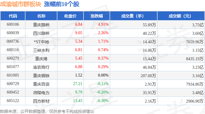 从资金流向上来看,当日成渝城市群板块主力资金净流出3443.38万元,游资资金净流入4080.23万元,散户资金净流出636.85万元。成渝城市群板块个股资金流向见下表: